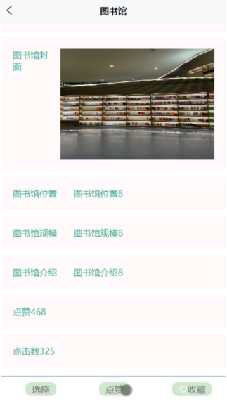 - 点击“图书馆”,可查看所有图书馆信息,支持图书馆名称搜索和点赞数、点击数、发布时间搜索,可点击查看详情(图书馆名称、图书馆封面、图书馆位置、图书馆规模、图书馆介绍、点赞、点击数),进行点赞和收藏,并可点击选座,提交图书馆选座信息(预约时间、选座);