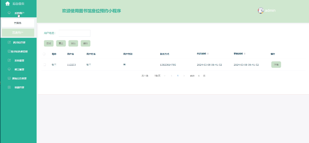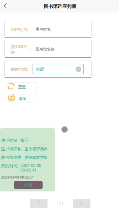 - 点击“图书馆选座”,可查看自己的图书馆选座信息,进行查询操作,支持用户姓名、图书馆名称、审核状态搜索,可点击查看详情(普通用户、用户姓名、图书馆名称、图书馆位置、预约时间、审核状态)。