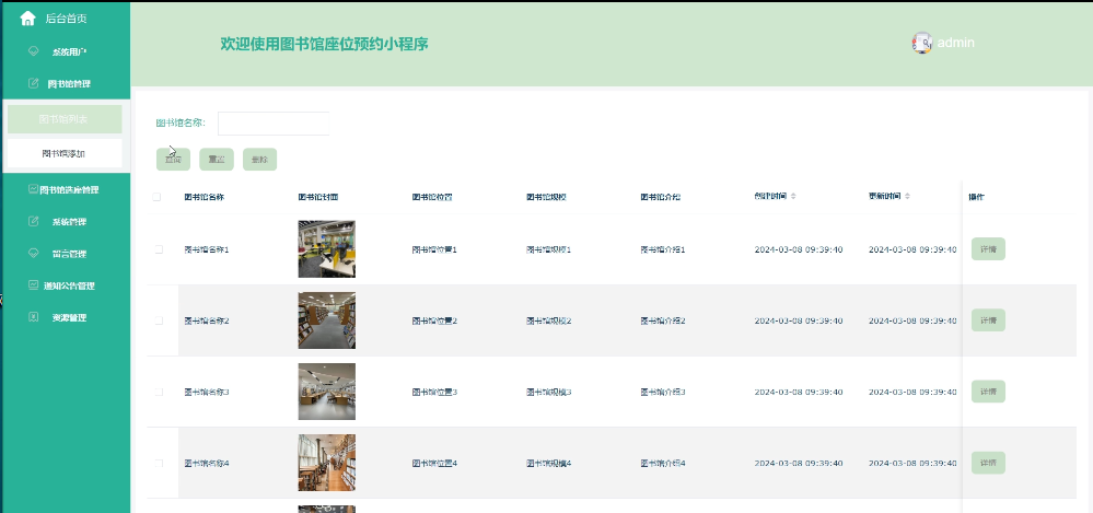 - 图书馆管理:可查看所有图书馆信息,进行增改删查操作,支持图书馆名称搜索,可点击查看详情(图书馆名称、图书馆封面、图书馆位置、图书馆规模、图书馆介绍)。
