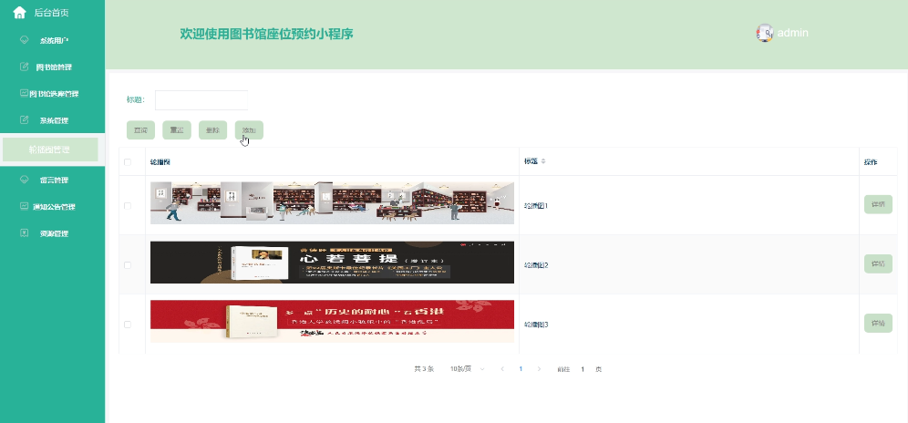 - 系统管理:可对首页的轮播图进行管理,进行增删改查操作,支持标题搜索,可点击查看详情(轮播图、标题)。