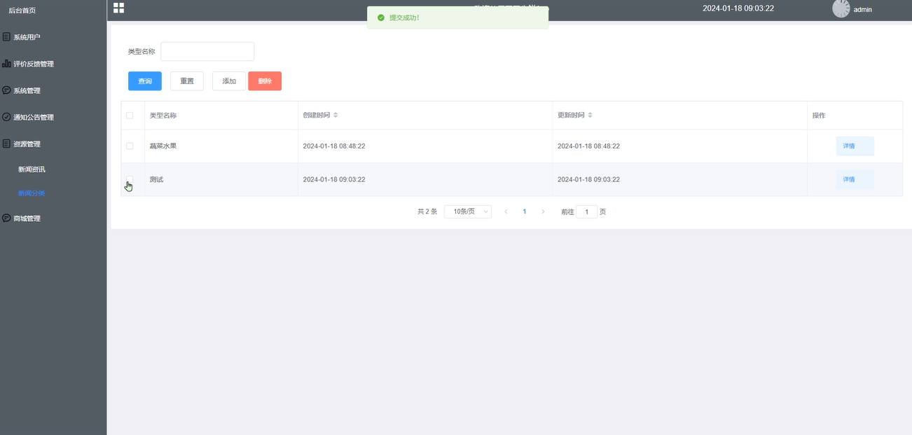 资源管理,资源管理包括新闻资讯和新闻分类功能。管理员可以对新闻资讯进行增加、删除、编辑和查看操作,同时对新闻进行分类管理,包括增删改查分类信息,以便用户更好地浏览和筛选新闻内容。管理员还可以查看用户对新闻资讯的评论,进行管控和审核,确保评论内容的规范性和质量,如图5-12所示。