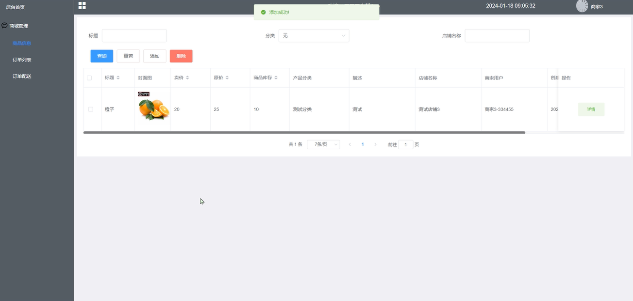 商家用户可以在商城管理模块中轻松管理商品信息,包括增删改查和查看详情操作,确保商品信息的准确性和及时更新。同时,商家用户可以管理订单列表,进行订单的增删改查和查看详情操作,提供及时的订单处理和客户服务。此外,商家用户还可以查询订单配送信息,进行配送状态的查询、重置、删除和查看详情操作,保证订单及时配送并提供良好的配送体验。如图5-14所示。