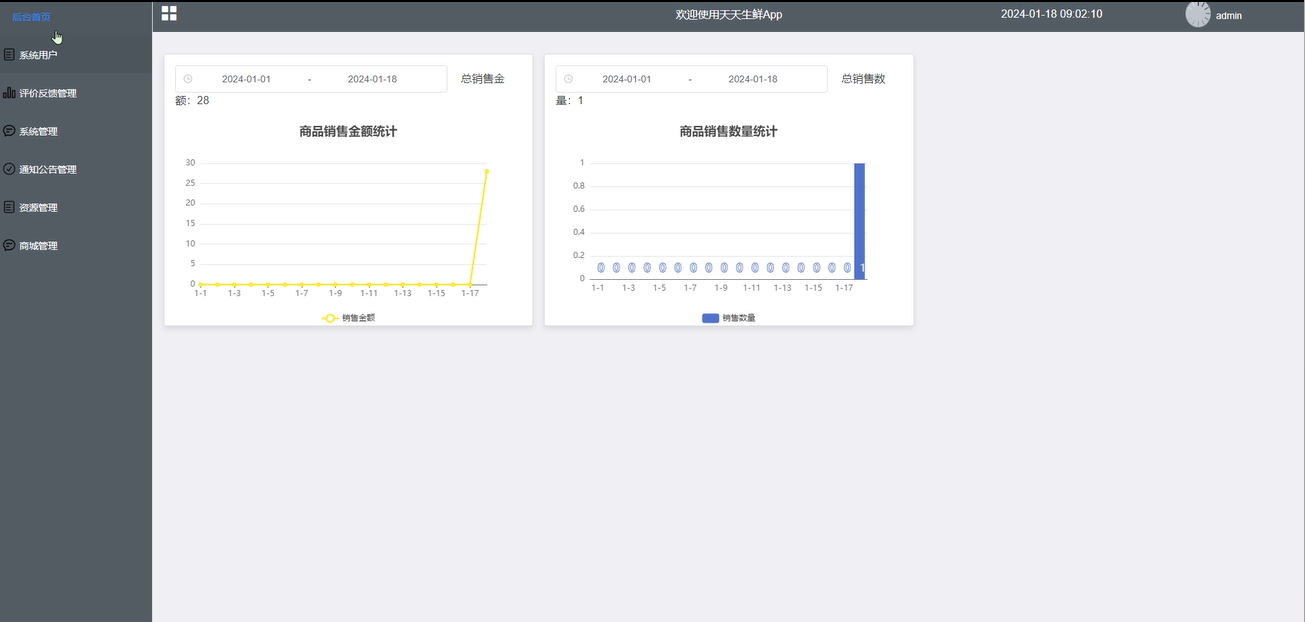 在管理员功能页面可以查看,商品销售金额统计图、商品销售数量统计图、后台首页、系统用户、评价反馈管理、系统管理、通知公告管理、资源管理、商城管理等内容进行相对应操作,如图5-10所示。