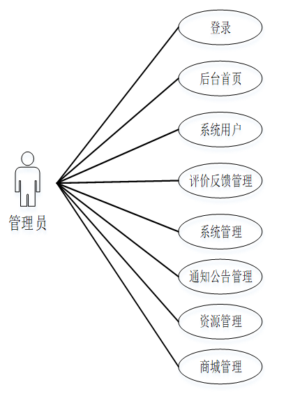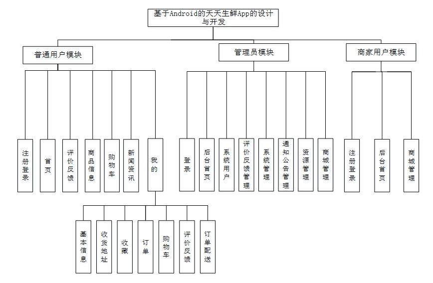 基于Android的天天生鲜App基于现有的手机,可以实现管理员,后台首页、系统用户、评价反馈管理、系统管理、通知公告管理、资源管理(新闻资讯、新闻分类)、商城管理(商品信息、分类列表、订单列表、订单配送)等详细的了解及统计分析,根据系统功能需求建立的模块关系图如下图: