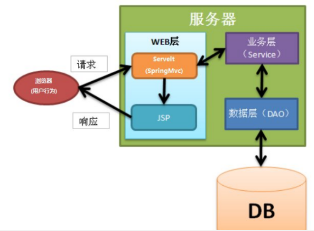 页面发送请求给控制器,控制器调用业务层处理逻辑,逻辑层向持久层发送请求,持久层与数据库交互,后将结果返回给业务层,业务层将处理逻辑发送给控制器,控制器再调用视图展现数据。