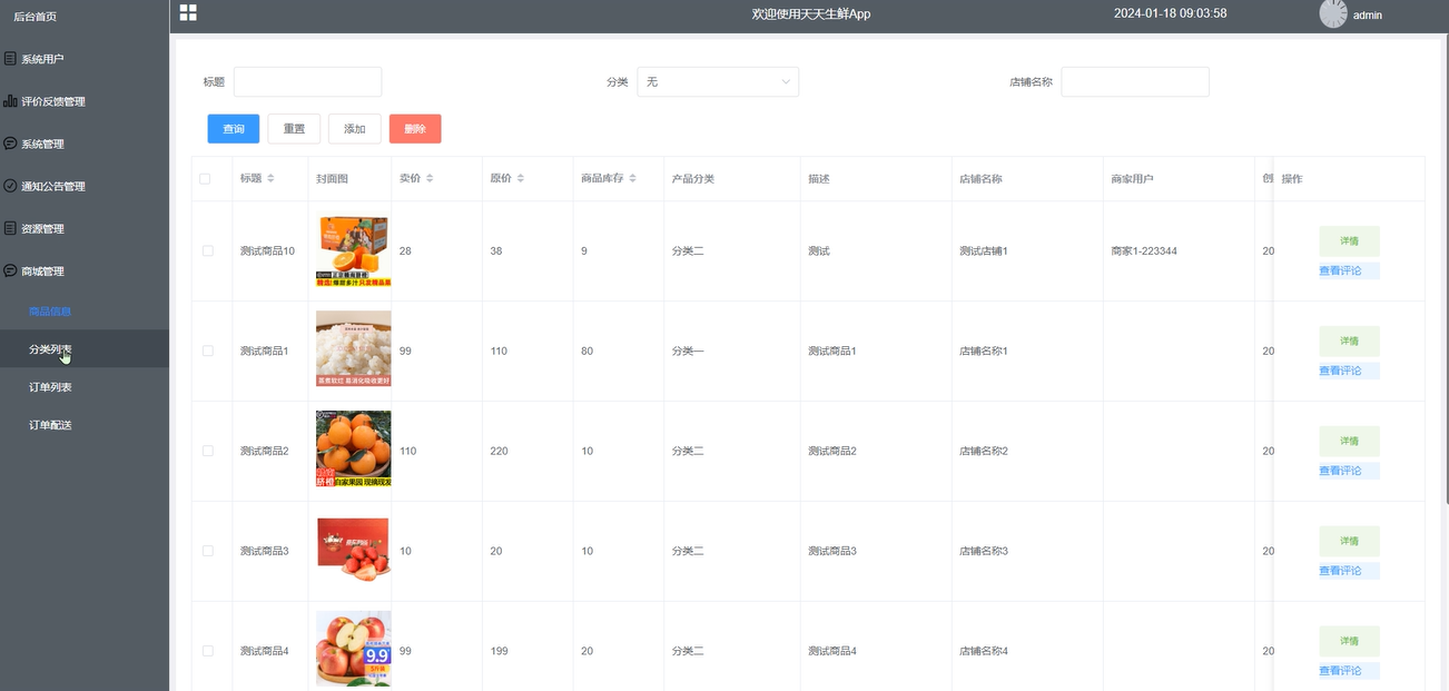 商城管理,商城管理包括商品信息管理、分类列表管理、订单列表管理和订单配送管理功能。管理员可以对商品信息进行增加、删除、编辑和查看详情操作,同时对用户评论进行管控。此外,管理员还可以对商品分类列表进行增删改查和查看详情,管理订单列表包括查询、重置、删除和查看详情操作,以及订单配送管理包括查询、重置、删除和查看详情操作。这些功能帮助管理员有效管理商城运营和订单配送流程,如图5-13所示。