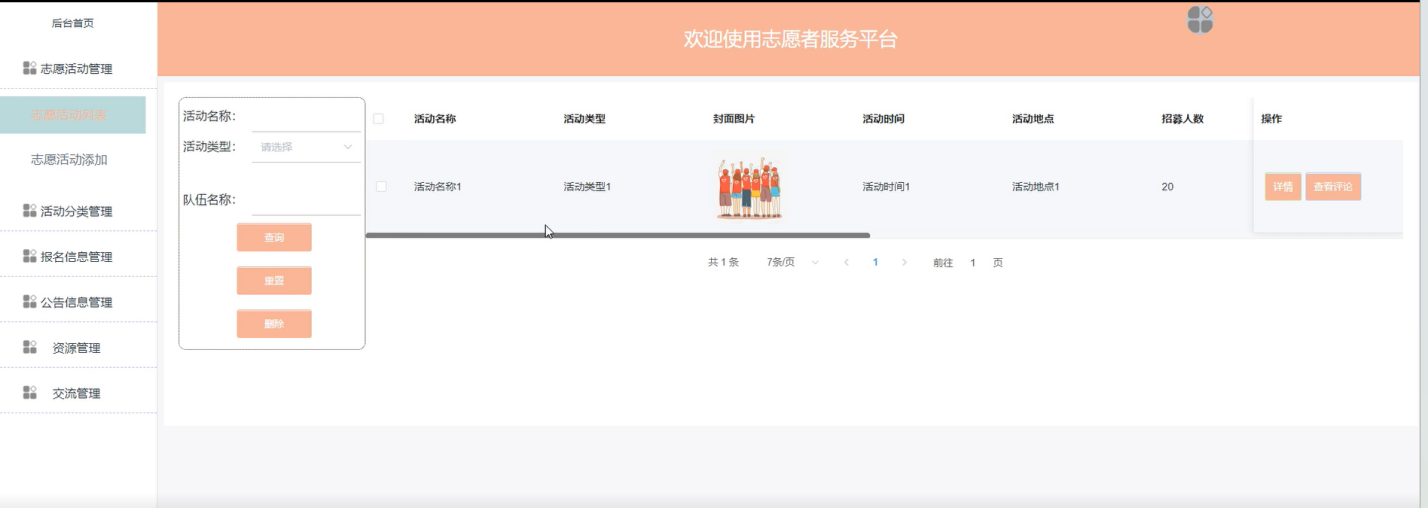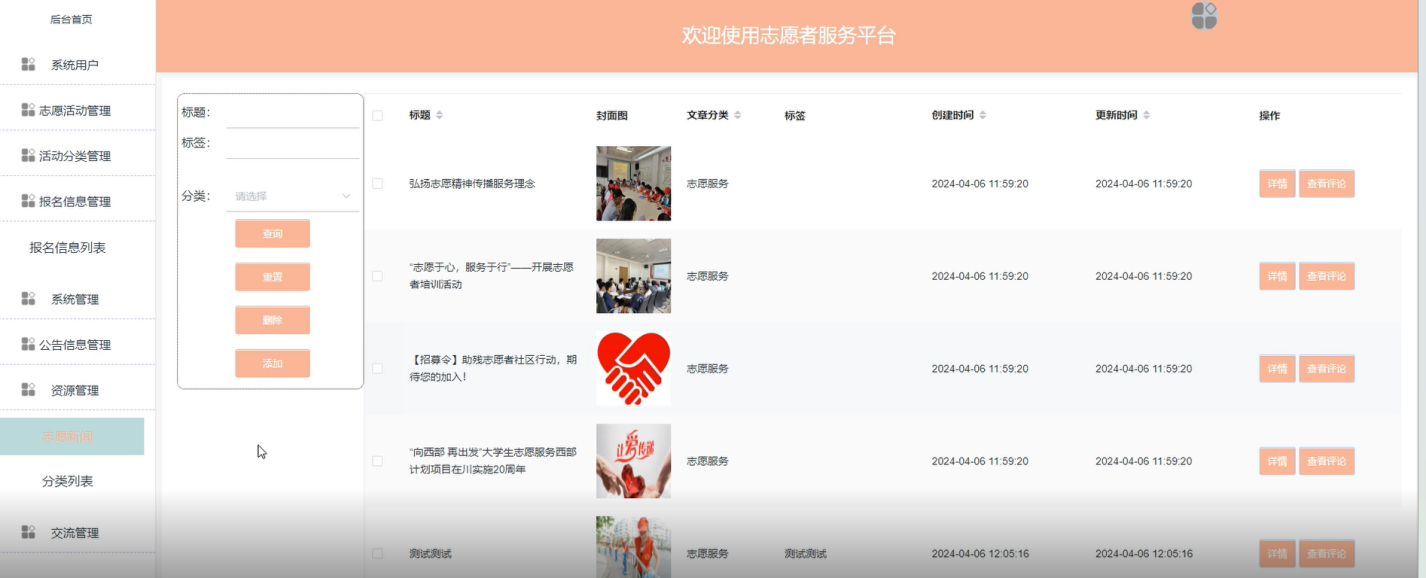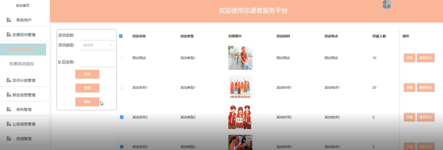 志愿者活动管理:管理员可以发布、编辑、审核和删除志愿活动,确保活动质量和有效性。界面如下图所示。