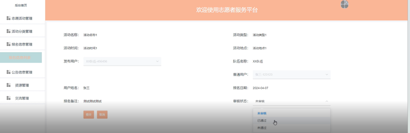 (5)报名信息管理:管理员可以查看和管理志愿者的报名信息,包括审核报名信息、统计报名人数等。