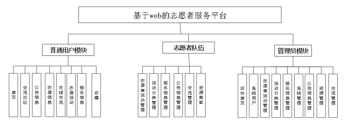 按照基于web的志愿者服务平台的角色,系统划分为了普通用户模块、志愿者队伍模块和管理员模块这三大部分。