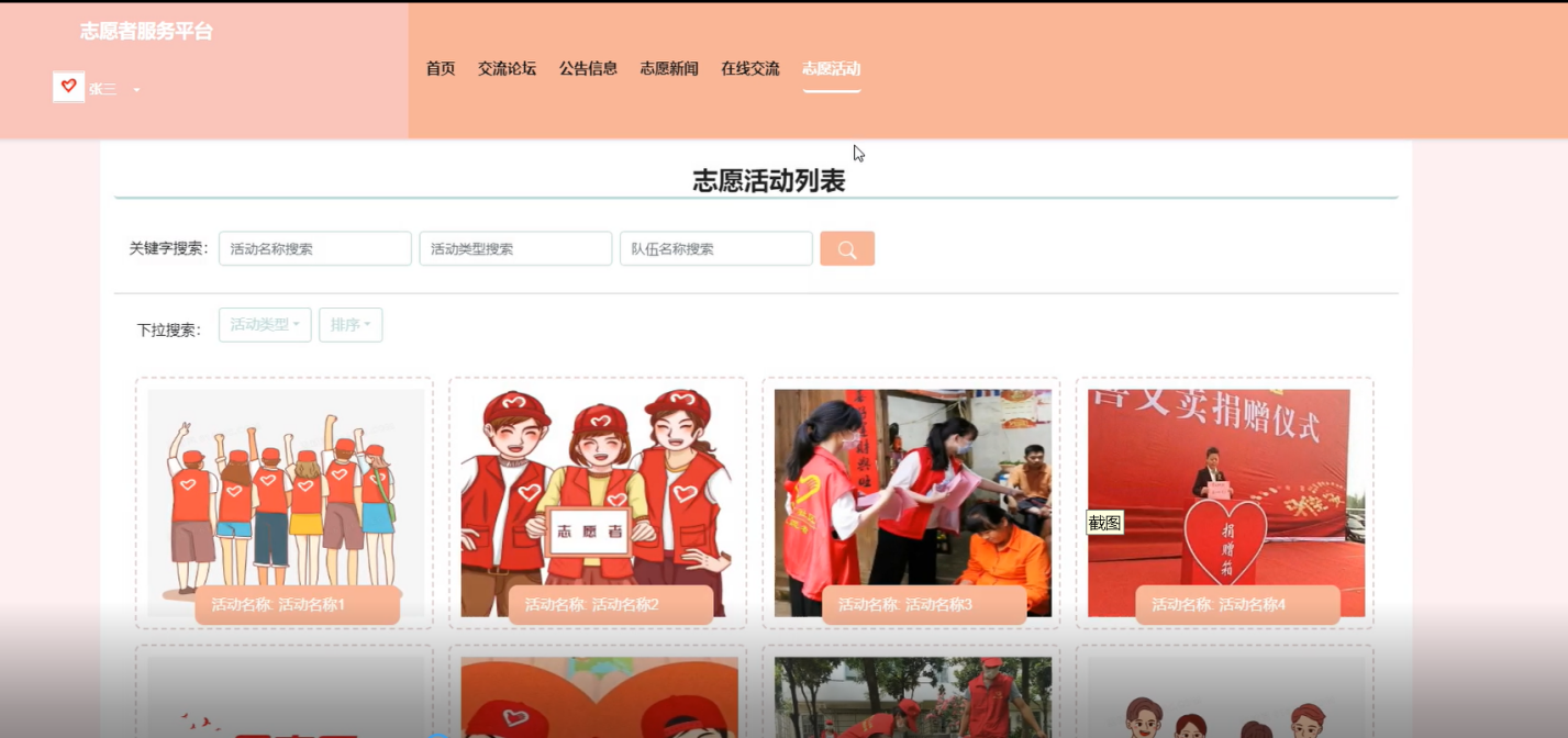 志愿活动:列出各类志愿活动信息,包括时间、地点、内容等,让用户选择自己感兴趣的活动。。界面如下图所示。