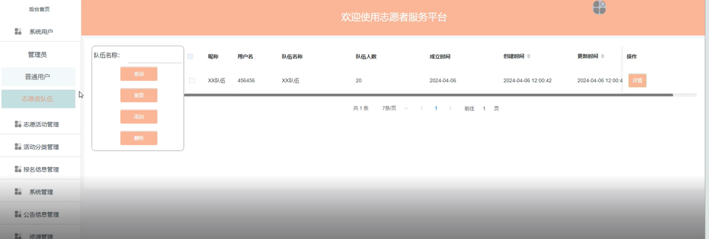 (9)收藏:用户可以收藏感兴趣的志愿活动、文章等内容,方便日后查阅或参考。志愿者队伍: