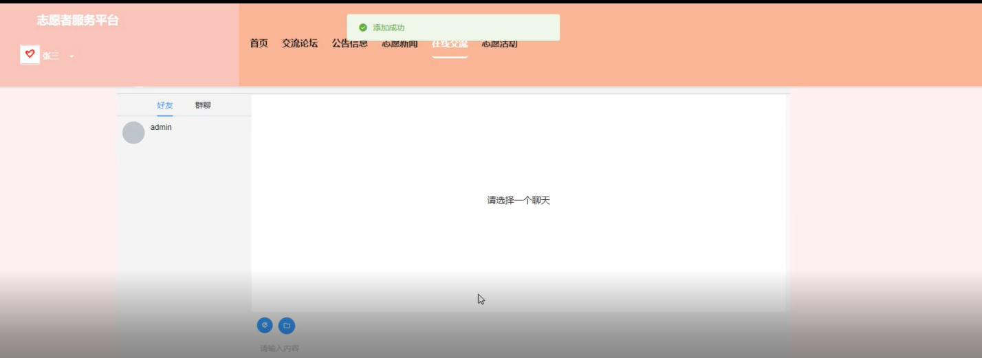 在线交流:提供实时在线聊天或留言板功能,方便用户之间交流、讨论志愿服务相关话题。页面如图4-4所示。