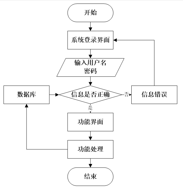用户打开并进入系统后,会先显示登录界面,输入正确的用户名和密码,系统自动检测信息,若信息无误,则用户会进入系统功能界面,进行操作,否则会提示错误无法登录,操作流程如图2-3所示。