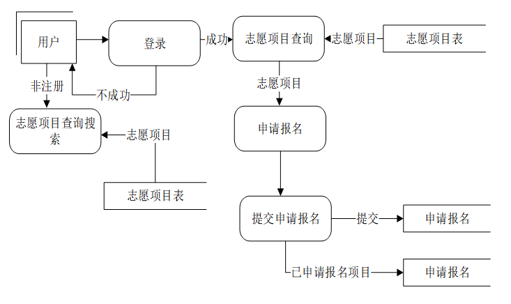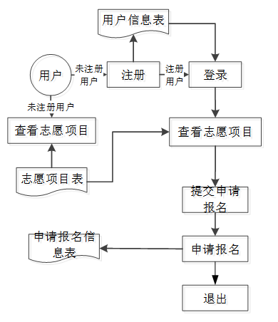 志愿服务管理系统主要的目的就是实现对志愿项目的申请报名,图2-1就是系统的数据流图。