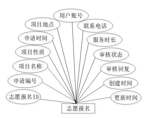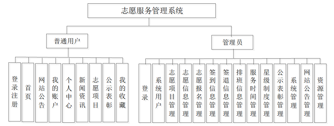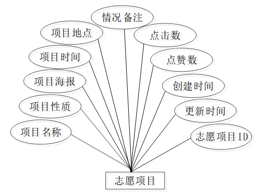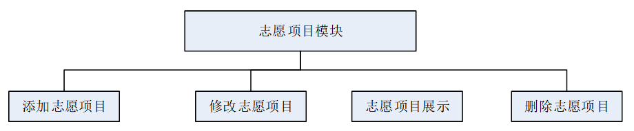 志愿服务管理系统是中需要存储不少志愿项目信息,其模块功能结构,具体的结构图如下:
