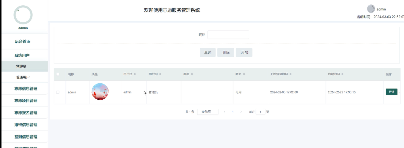 (2)系统用户:管理员点击“系统用户”这一菜单会显示管理员+普通用户这两个子菜单,管理员可以对这两个角色的信息进行增删改查操作。