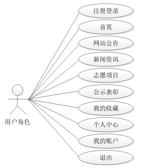 通过2.3功能的分析,得出了本志愿服务管理系统的用例图: