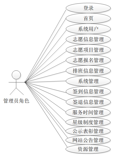 web后台管理上的管理员是维护整个志愿服务管理系统中所有数据信息的。管理员角色用例如图2-4所示。