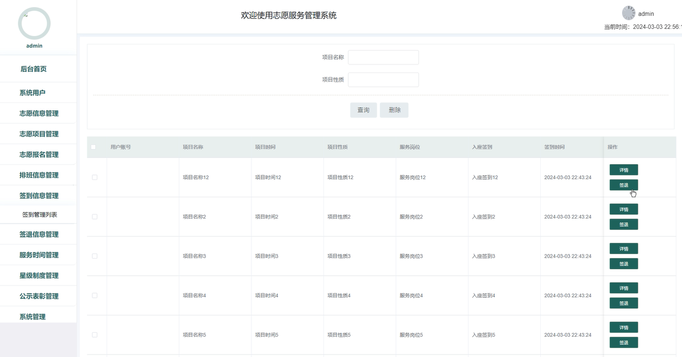 (6)签退信息:管理员点击“签退信息”这一菜单可以对签退信息进行管控,点击某一条签退信息可进行详情查阅。
