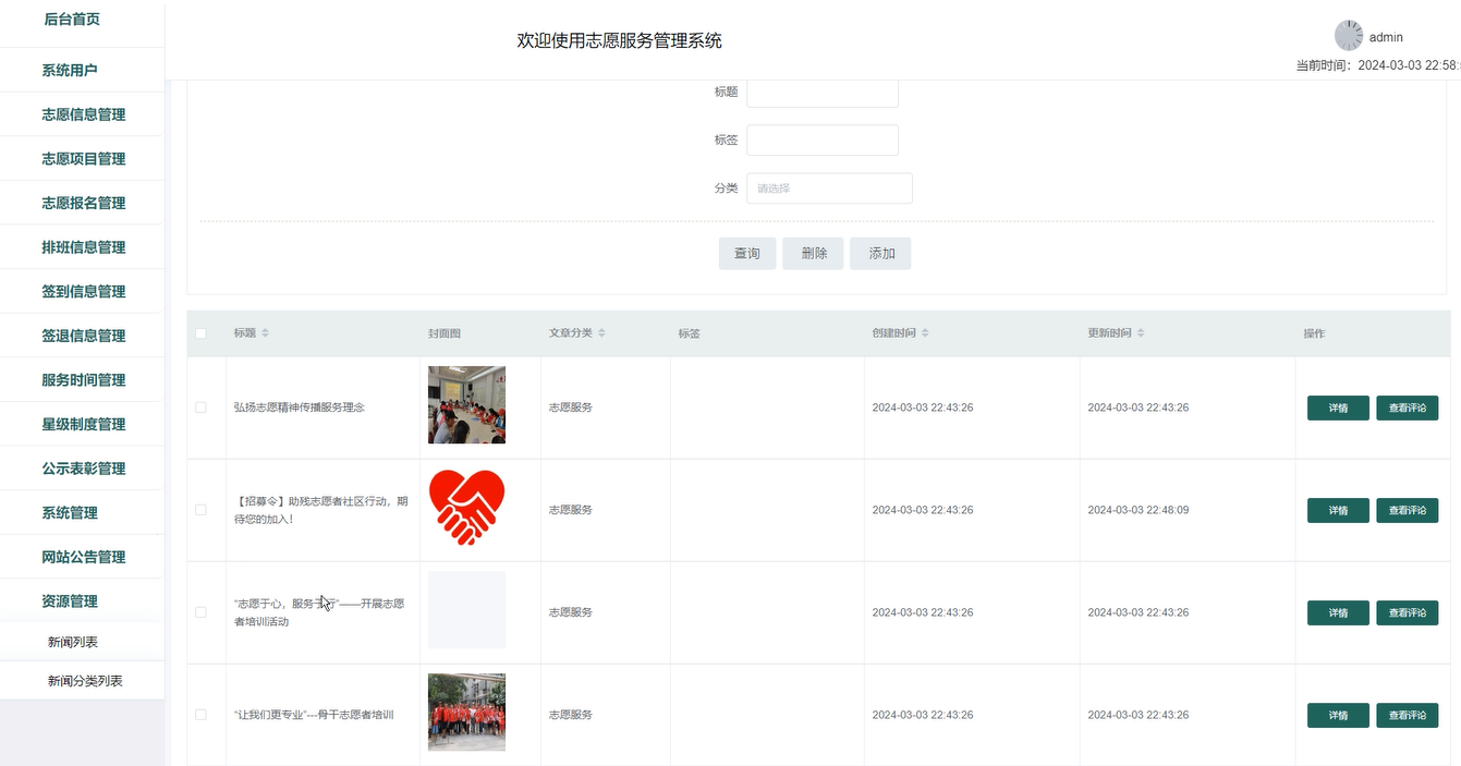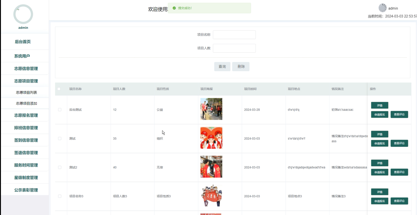 (3)志愿项目:管理员点击“志愿项目”这一菜单会所有的志愿项目,管理员可以对志愿项目进行增删改查操作,同时也可以查看前台用户对志愿项目提交的评论。