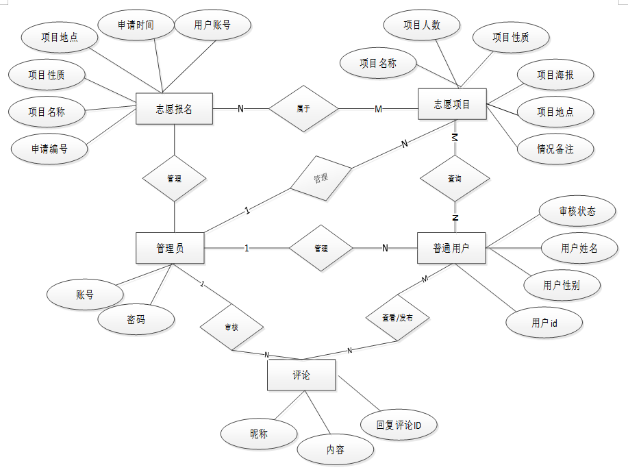 下面根据志愿服务管理系统的数据库总E-R关系图可以得出志愿服务管理系统需要很多E-R图,在此罗列出来一些主要的数据库E-R模型图。