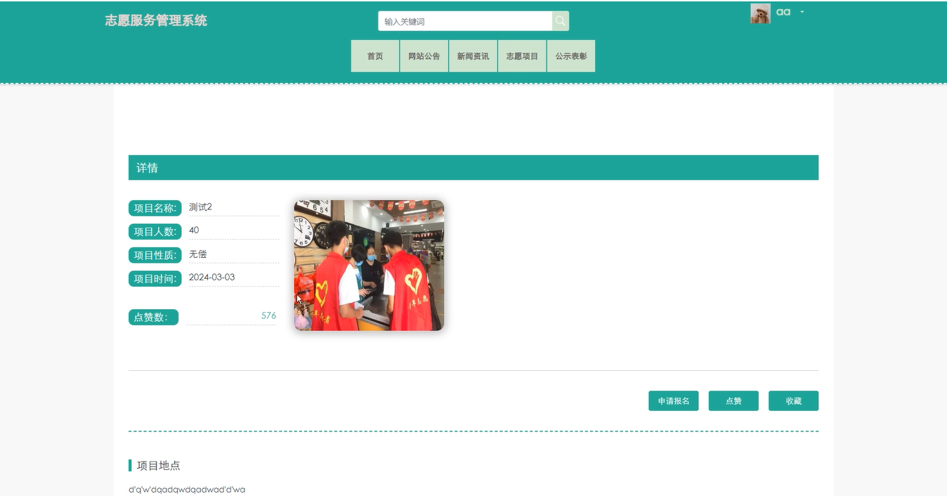 (2)志愿项目:用户进行志愿项目的阅览,通过查询志愿项目信息,可对某一个志愿项目进行申请报名+点赞+评论+收藏。