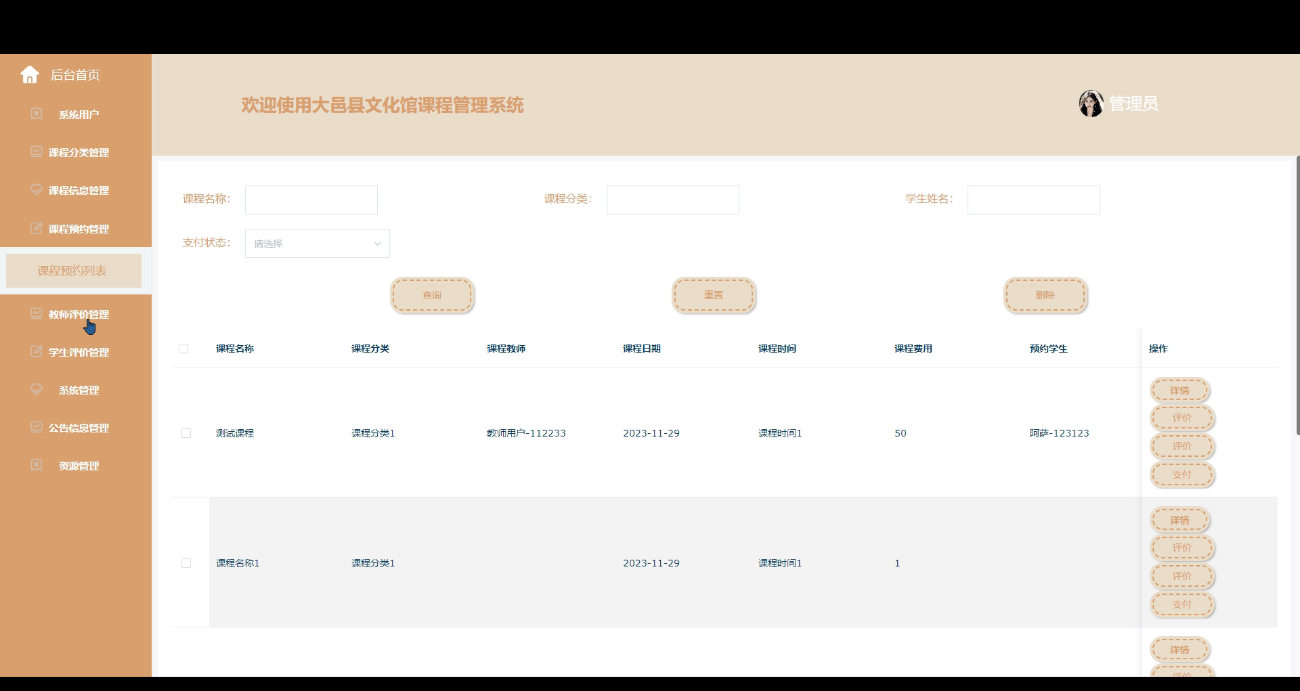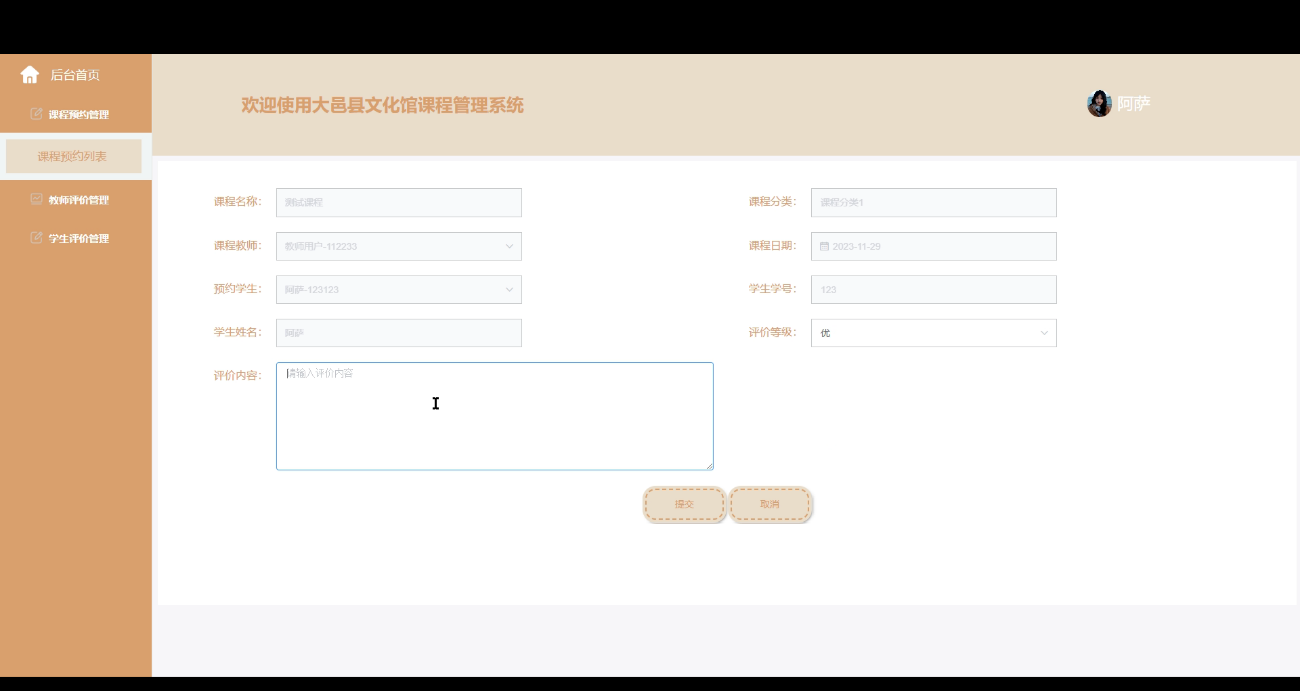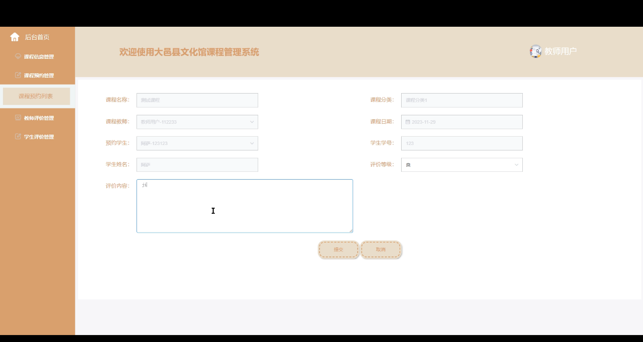 教师评价管理:教师可以使用系统提供的评价功能,对学生的学习态度、参与度、作业质量等方面进行评价。包括课程名称、分类、教师、日期、预约学生、学生学号、学生姓名、评价等级、评价内容等内容。可以基于不同的评价指标或评分体系,为学生提供具体的反馈和建议。界面如下图所示。