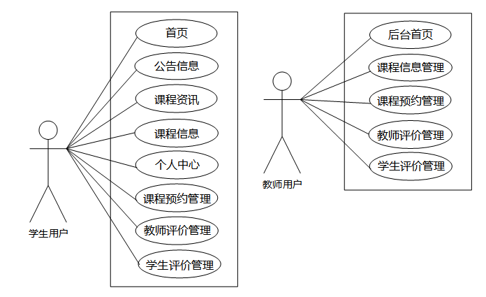 该课程管理系统包括学生用户、管理员和教师用户三个角色。学生用户可以在首页浏览热门活动、公告信息、课程资讯,并进行课程预约和评价教师。管理员负责后台管理,包括系统用户管理、课程分类管理、课程信息管理、预约管理、评价管理等。教师用户可以管理自己的课程信息,审核学生预约并查看学生评价。通过这些功能,系统实现了方便的课程预约和管理,提升了课程管理的效率和用户体验。具体如下。