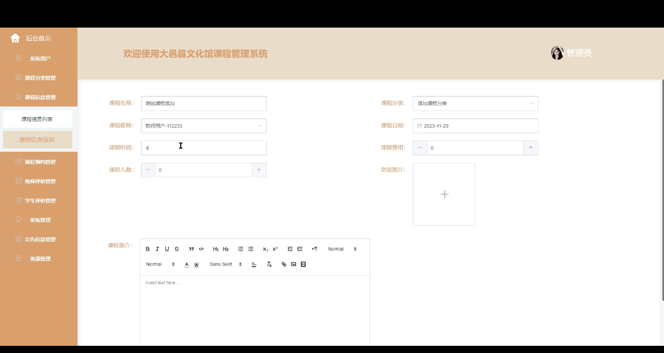 课程信息管理:管理员和教师可以发布、编辑和删除自己负责的课程信息,包括课程名称、分类、教师、日期、时间、费用、人数、封面图片、课程简介等详细信息。界面如下图所示。