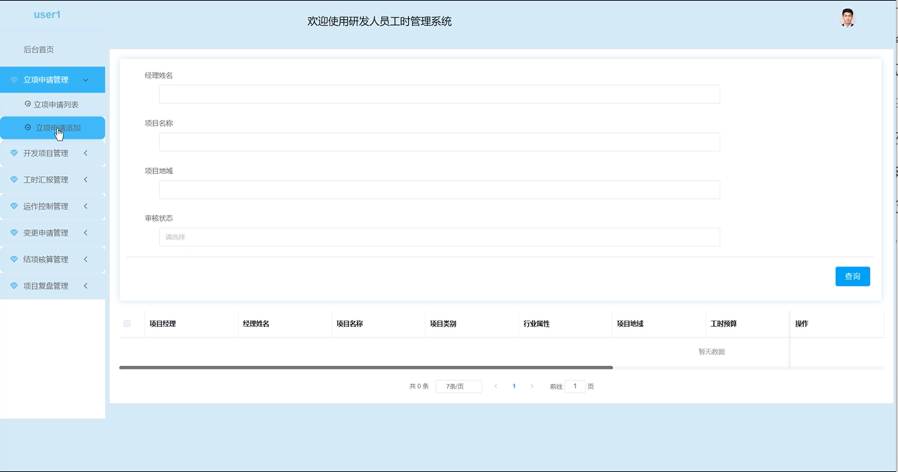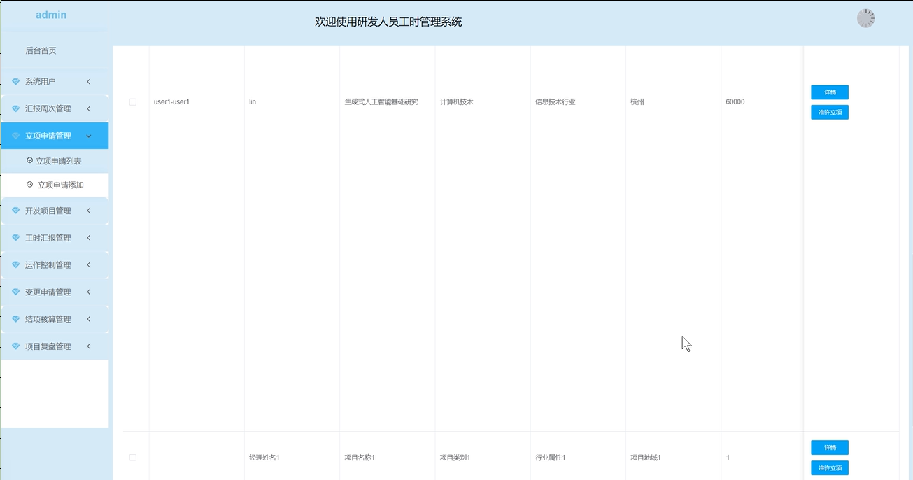 - 立项申请管理:管理员可以对立项申请进行列表展示、添加、查看详情,并对申请进行准许或拒绝等操作。通过搜索功能,快速定位到特定经理、项目名称、项目地域或审核状态的立项申请。