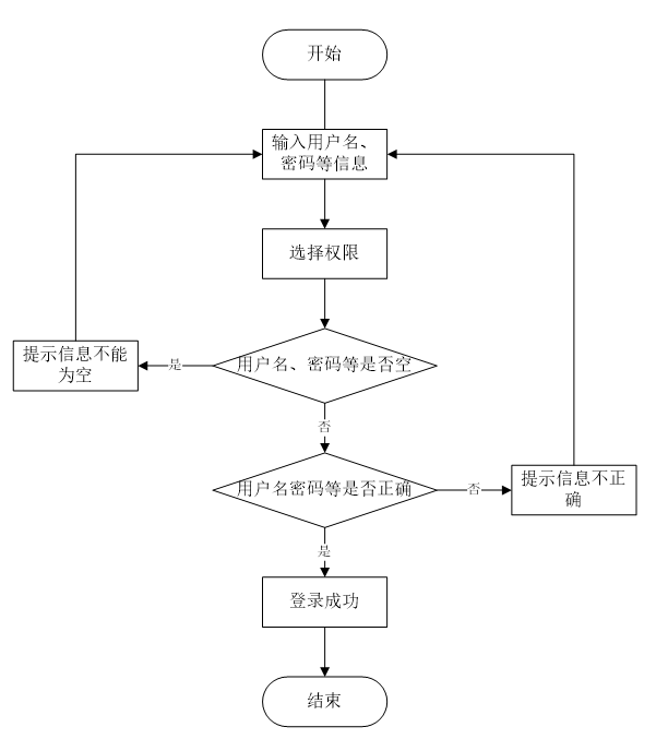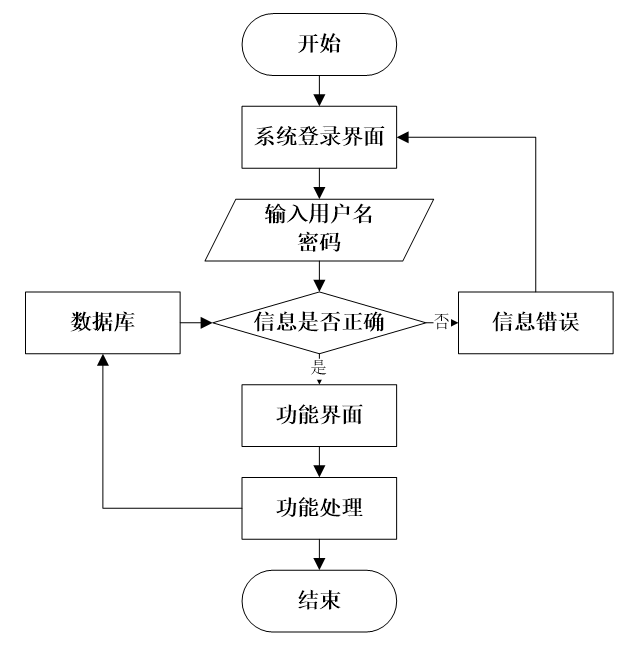 用户打开并进入系统后,会先显示登录界面,输入正确的用户名和密码,系统自动检测信息,若信息无误,则用户会进入系统功能界面,进行操作,否则会提示错误无法登录,操作流程如图2-3所示。