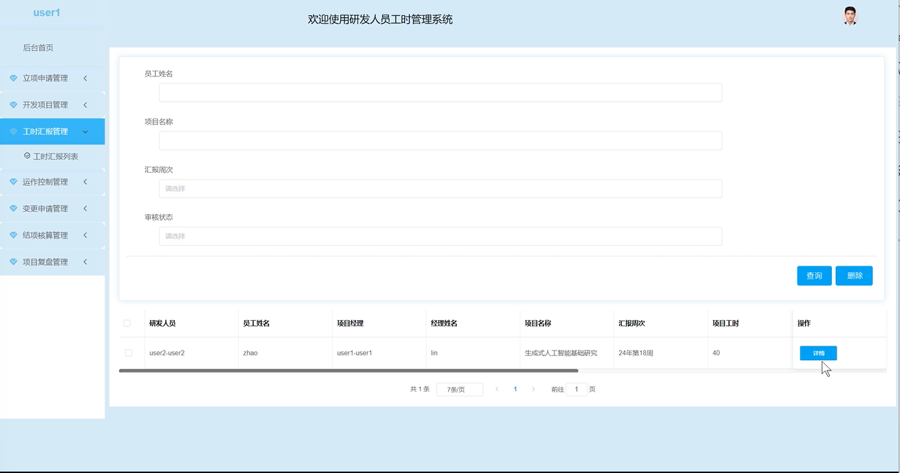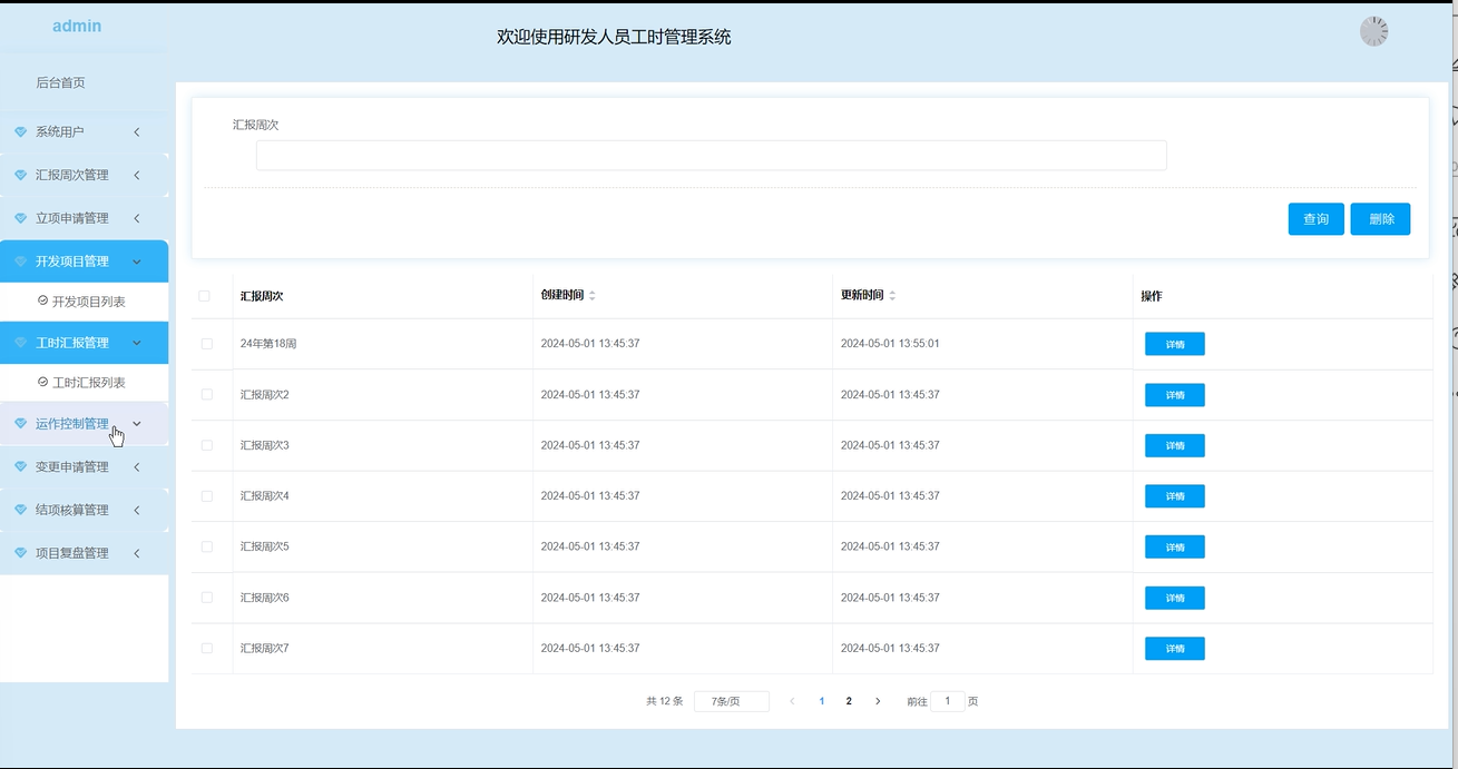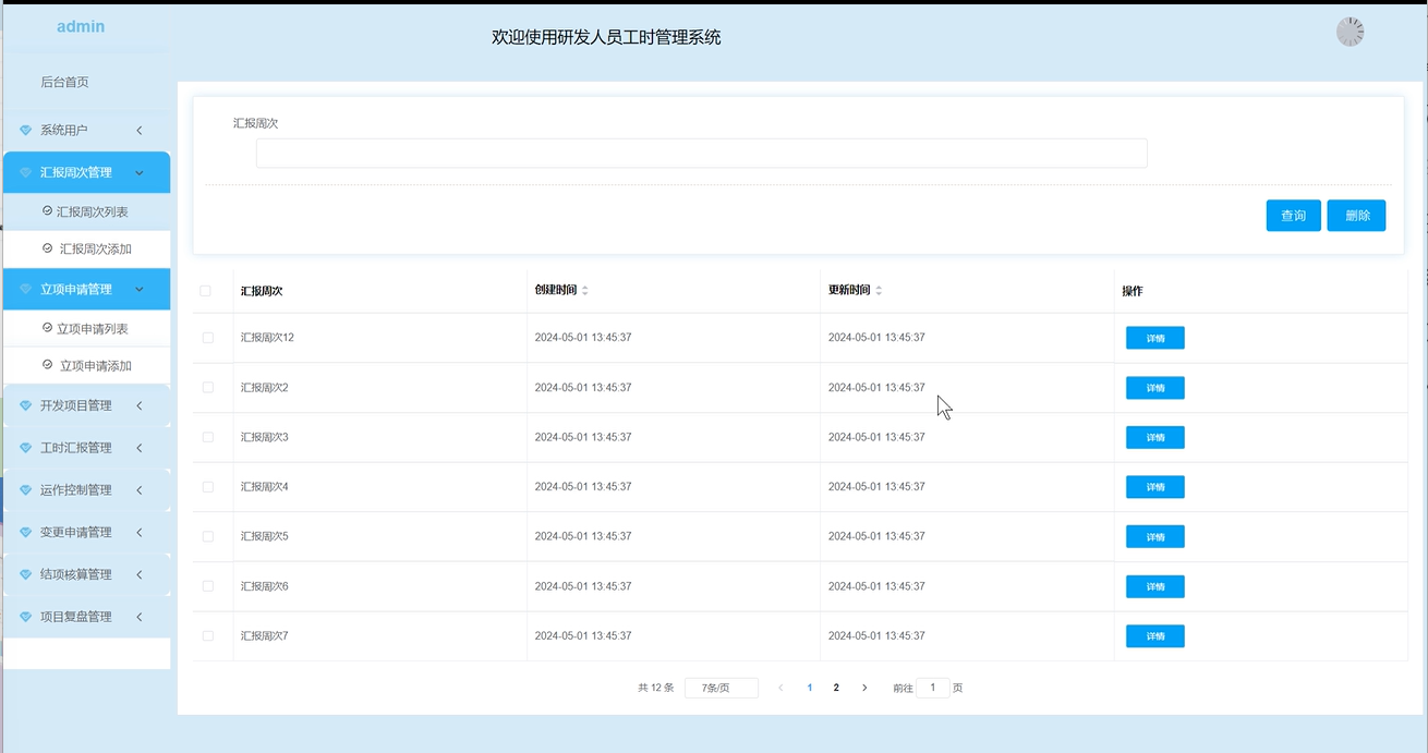 - 工时汇报管理:管理员可以列表展示、查看详情、查询和删除工时汇报,同时按汇报周次进行搜索,有效管理工时数据。