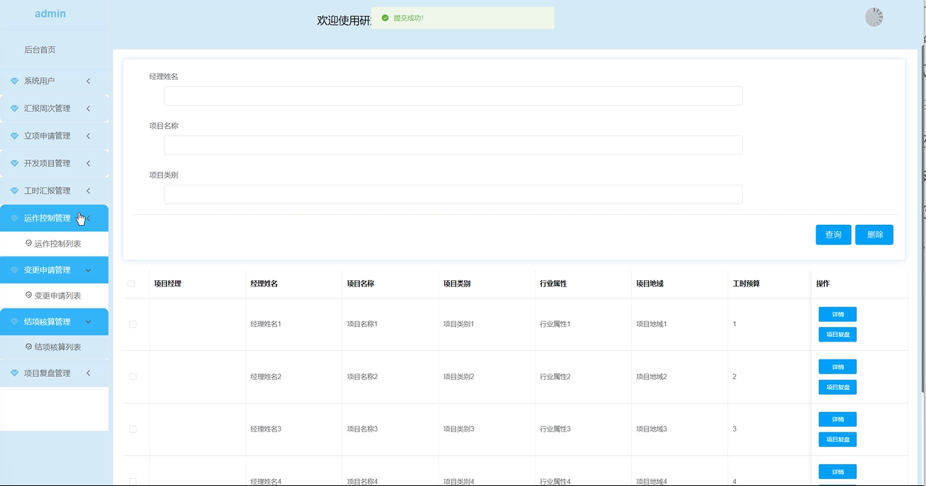 - 运作控制管理:管理员可以查看运作控制列表和详情,进行查询和删除操作。通过搜索功能,按经理姓名、项目名称、汇报月份或审核状态快速定位到特定运作控制。