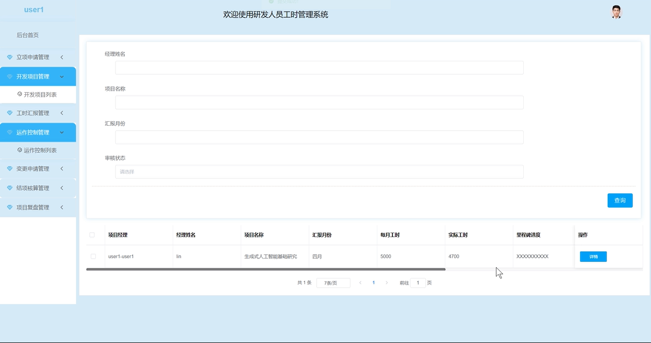 - 开发项目管理:管理员可以查看项目列表和详情,包括汇报详情、运作控制、申请变更和结项核算等相关操作。通过搜索功能,按经理姓名、项目名称或项目类别快速筛选项目。