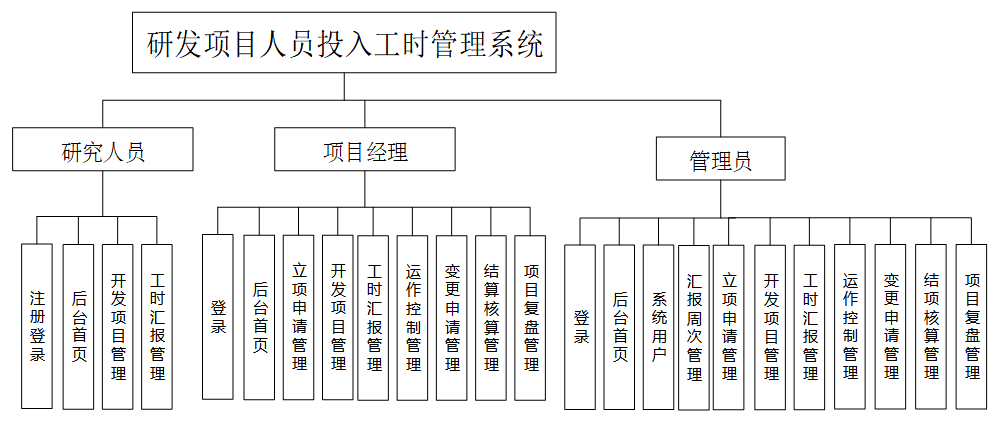 按照研发项目人员投入工时管理系统的角色,我划分为了研发人员用户模块、项目经理用户模块和管理员模块。