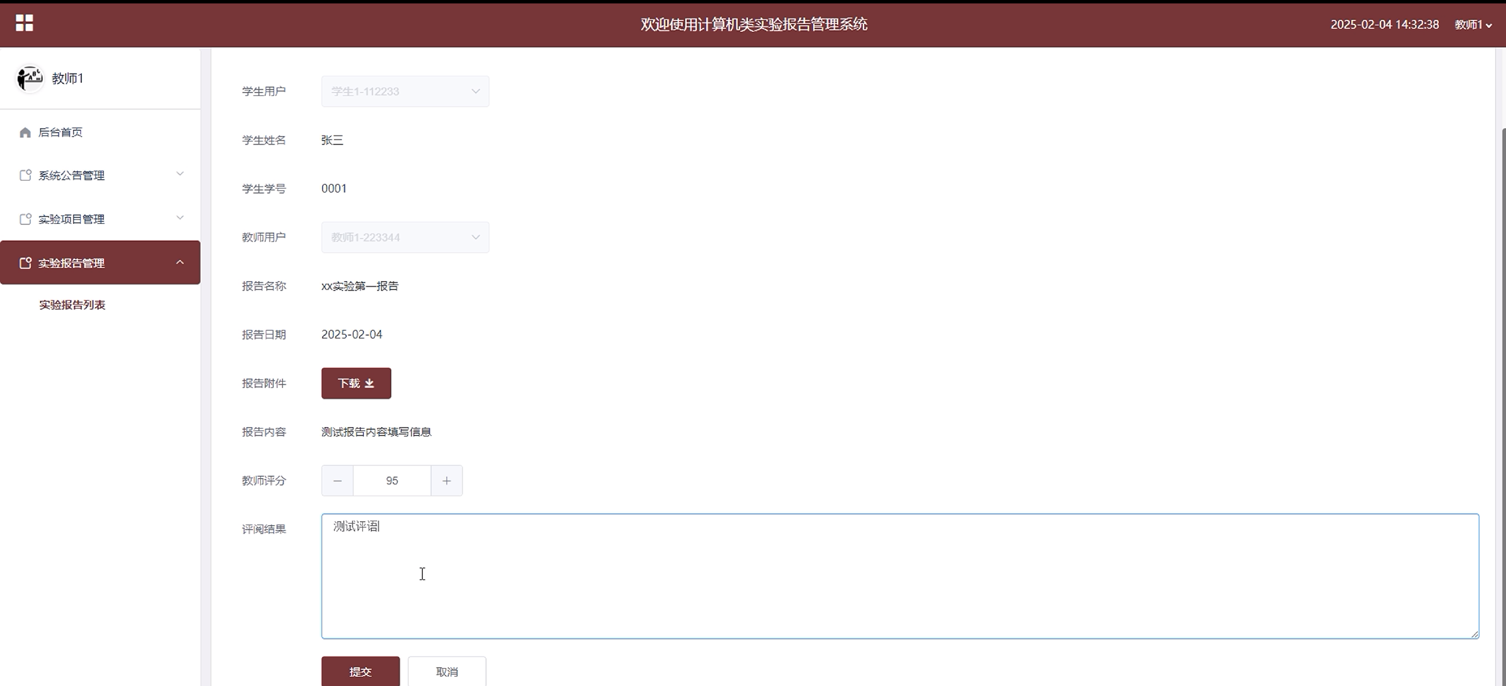 The purpose of this study is to design and implement a comprehensive computer experimental report management system to improve the efficiency and quality of experimental teaching management. The system is mainly for three types of users: administrators, students and teachers, each with different permissions and functional modules. Administrator through the background management system for user information, system announcements, experimental projects and classification for comprehensive management, and can view the relevant data statistics chart. Student users can submit lab reports, view lab projects and system announcements, and manage their personal information. Teacher users can view and download lab projects and report attachments, fill in grades and review results, and better manage and evaluate student lab performance. Through this layered management mode, the system not only improves the efficiency of experimental teaching management, but also enhances the user experience and ensures the transparency and standardization of the experimental teaching process.