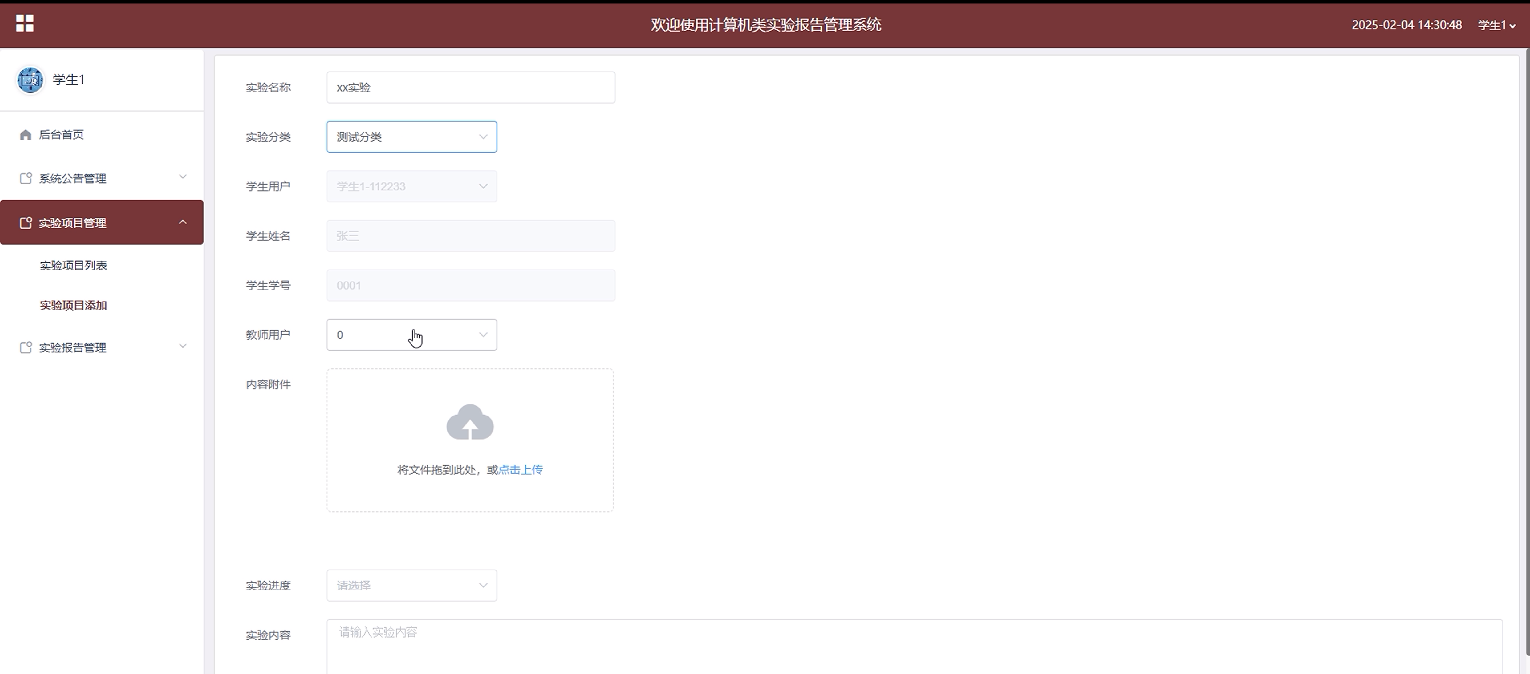 实验项目管理:实验项目管理包含实验项目列表和实验项目添加;点击“实验项目添加”可填写相关信息,包括实验名称、实验分类、学生用户、学生姓名、学生学号、教师用户、内容附件、实验进度和实验内容。点击“提交报告”按钮可填写相关信息,包括报告名称、报告日期、报告附件和报告内容。界面如下图4-4所示。