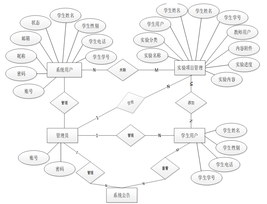 在数据库概念模型设计的时候,一般都采用E-R实体图进行展示,在实体图中可以展示出数据库表中的所有字段名称。下面是整个计算机类实验报告管理系统中主要的数据库表总E-R实体关系图。