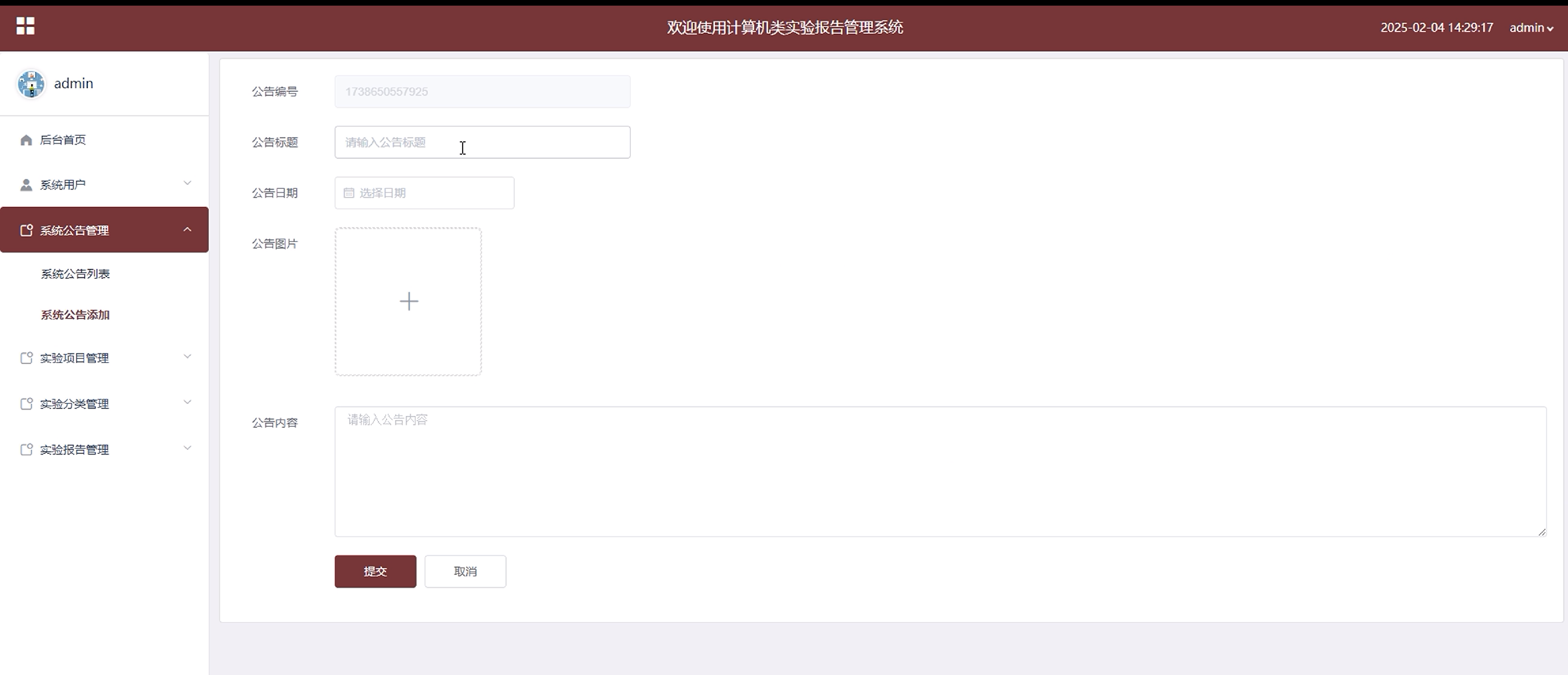 (4)系统公告管理:系统公告管理包含系统公告列表和系统公告添加;点击“系统公告添加”可填写相关信息,包括公告编号、公告标题、公告日期、公告图片和公告内容。