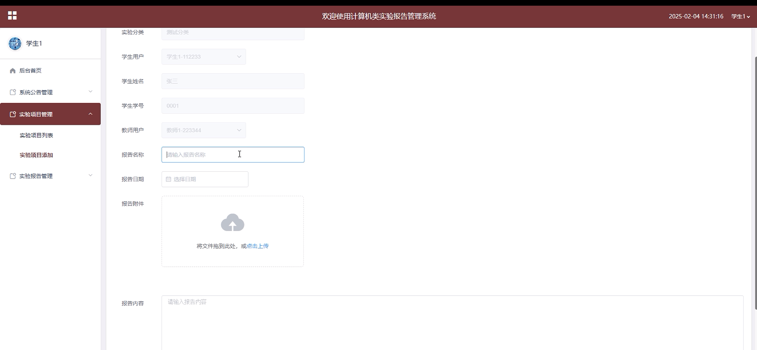 (4)实验项目管理:实验项目管理包含实验项目列表和实验项目添加;点击“实验项目添加”可填写相关信息,包括实验名称、实验分类、学生用户、学生姓名、学生学号、教师用户、内容附件、实验进度和实验内容。点击“提交报告”按钮可填写相关信息,包括报告名称、报告日期、报告附件和报告内容。
