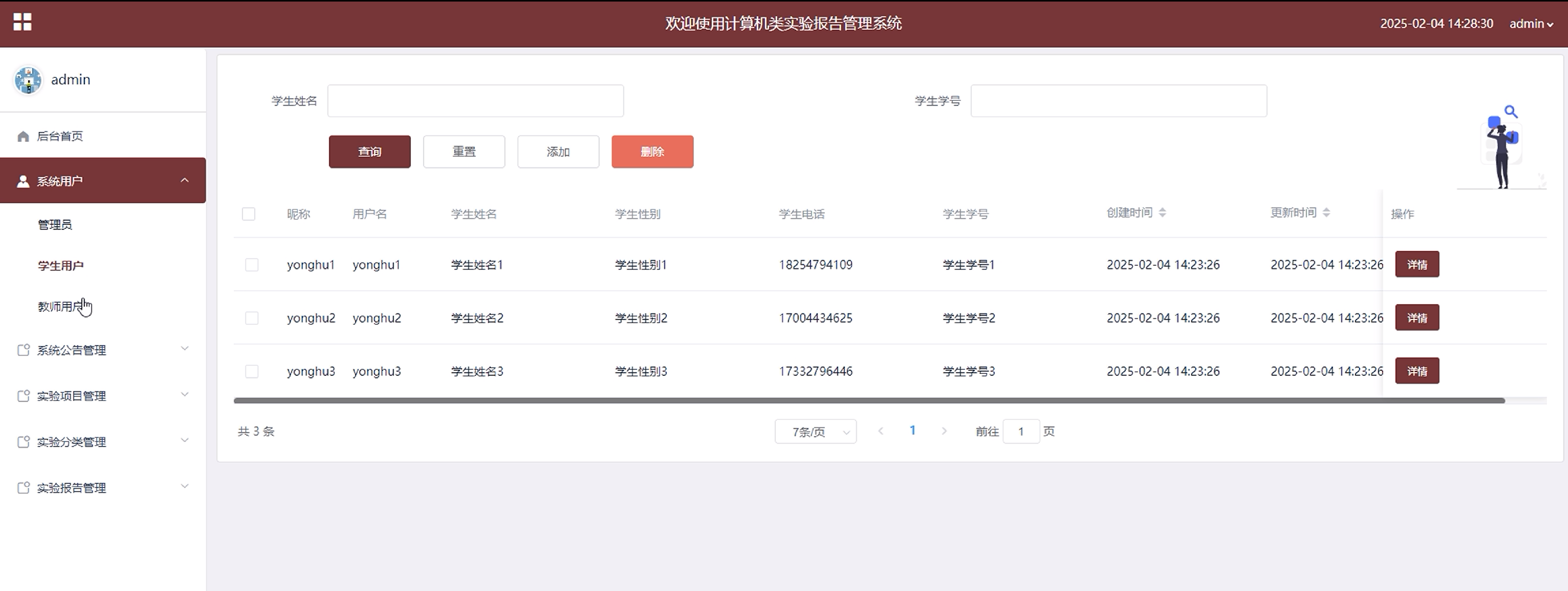 系统用户:管理员可以查看系统用户(管理员、学生用户和教师用户)列表中某个用户的详情,可以对用户信息进行查询、审核、添加和删除操作。界面展示如下图4-2所示。