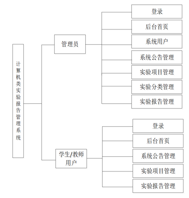 系统在结构上的设计至关重要,要考虑周全,设计全面,一个完善的结构体系,能够满足用户在使用时的各种需求,这样会让提高程序的使用率,保证程序被长久的利用。在设计计算机类实验报告管理系统的结构时,也列入重点,采用模块化的方法来进行设计,即首先将大模块确定下来,再慢慢的将大模块进行补充完善,向下分支出小模块,一起共同组成的系统的结构体系,下图是该计算机类实验报告管理系统的结构设计图,直观明了的可以看出本项目程序的功能。