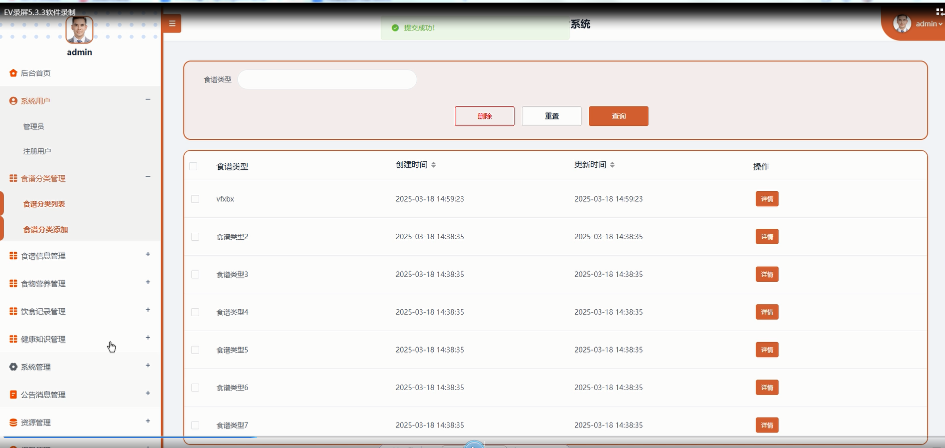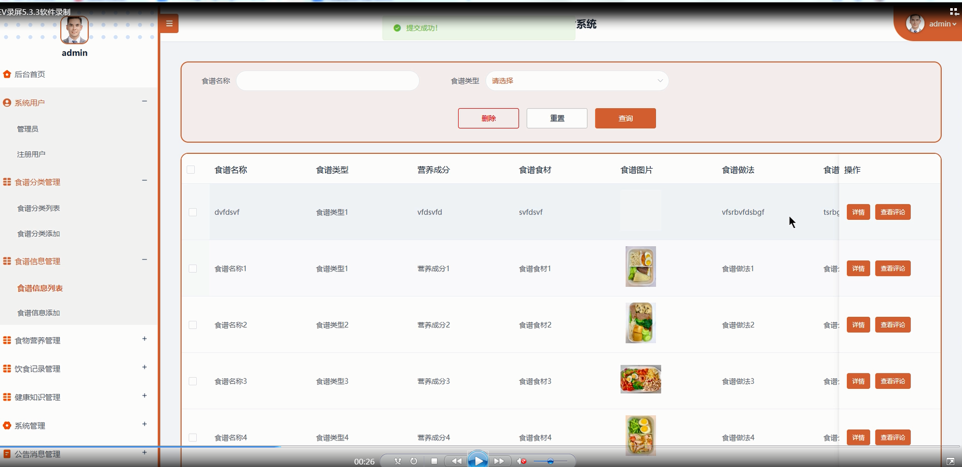 食谱信息管理:管理员可以增加、删除、修改食谱的详细信息,确保食谱库内容丰富且准确。