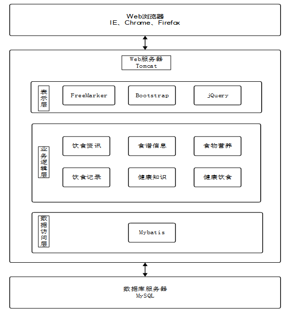 系统由表现层、业务逻辑层、数据访问层和数据库服务器组成。表现层通过浏览器(如IE、Chrome、Firefox)与用户交互,采用FreeMarker、Bootstrap、jQuery等技术实现界面呈现。业务逻辑层负责处理系统的核心业务逻辑,通过分模块设计实现功能分离。数据访问层使用MyBatis框架连接数据库,执行数据的增删改查操作。数据库服务器采用MySQL进行数据存储和管理,为系统提供稳定的数据库支持。整个架构通过Tomcat服务器完成用户请求的接收和处理,确保系统的高效运行[8]。整个系统架构如图4-1所示。
