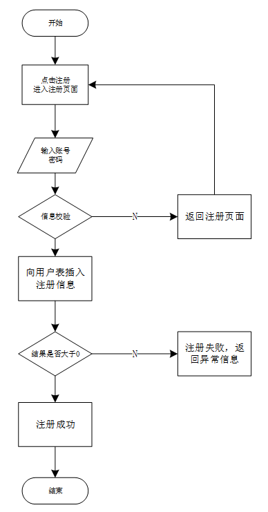 注册的过程,第一部分是账号的注册,第二部分是信息完善。在业务开展过程中,管理员可对用户信息进行修改等管理操作,注册流程如图4-3用户注册流程图所示。