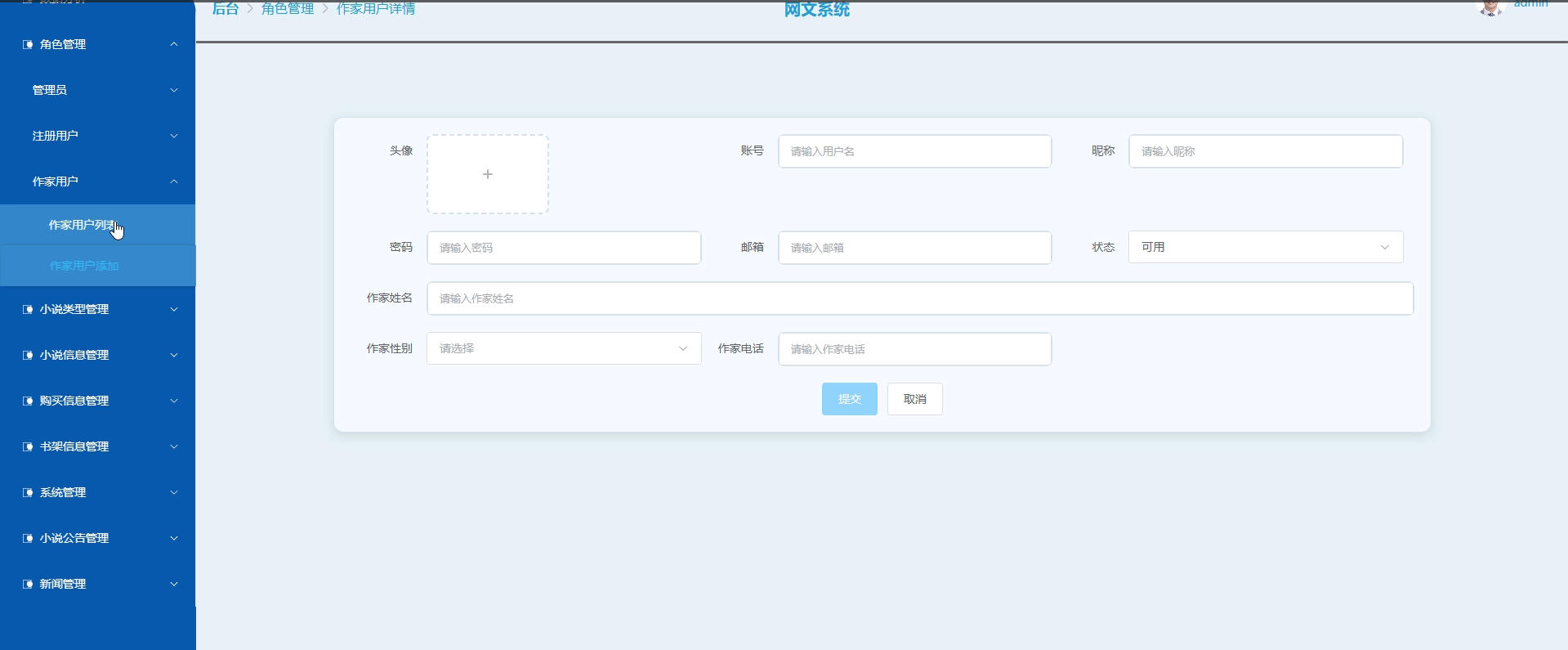 管理员通过作家添加功能可以对不同的作家用户信息进行添加、修改、删除以及查询操作。其界面如下图所示。