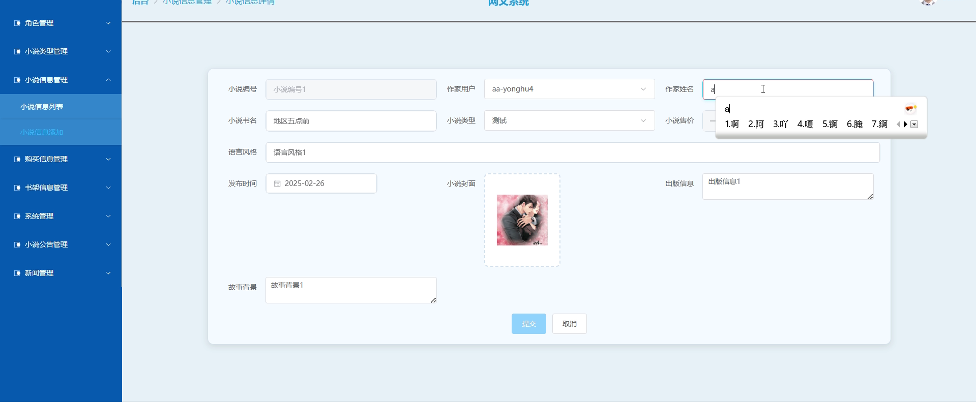 管理员可以通过专门的界面管理作家上传的小说信息,确保所有发布的内容符合平台规定。在维护过程中,管理员有权对小说的描述、分类、标签等进行编辑调整,同时也能监控作品内容的质量与合规性。其界面如下图所示。