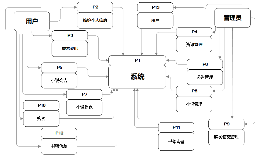 三、功能模块设计:平台功能设计将充分考虑用户的不同需求。普通用户可以查看小说资讯、小说公告,还可以在线中点击购买小说进行阅读。管理员可通过后台管理小说类型、小说信息、购买信息以及书架信息数据等。