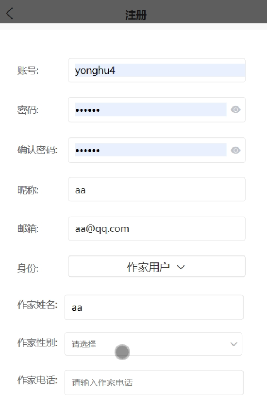 普通用户/作家用户需填写用户名、密码、手机号码、电子邮箱、身份等基本信息,系统自动验证信息格式准确性。注册成功后,用户信息加密存储于数据库,同时用户获得专属账号,可自由使用其功能权限等。其界面展示如下图所示。