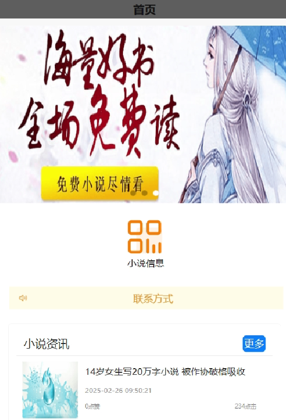 首页是注册用户进入基于微信小程序的网文系统的核心展示界面。它以直观且富有吸引力的布局,呈现小说资讯、小说通告、小说信息等。设有便捷搜索栏与分类导航,方便用户快速筛选和搜索。主界面展示如下图所示。